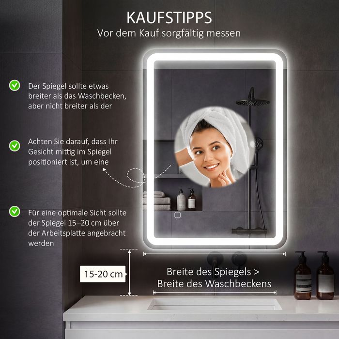 - Anti-Beschlag-Badspiegel mit automatischer Abschaltung nach 30 Minuten für Energieersparnis
