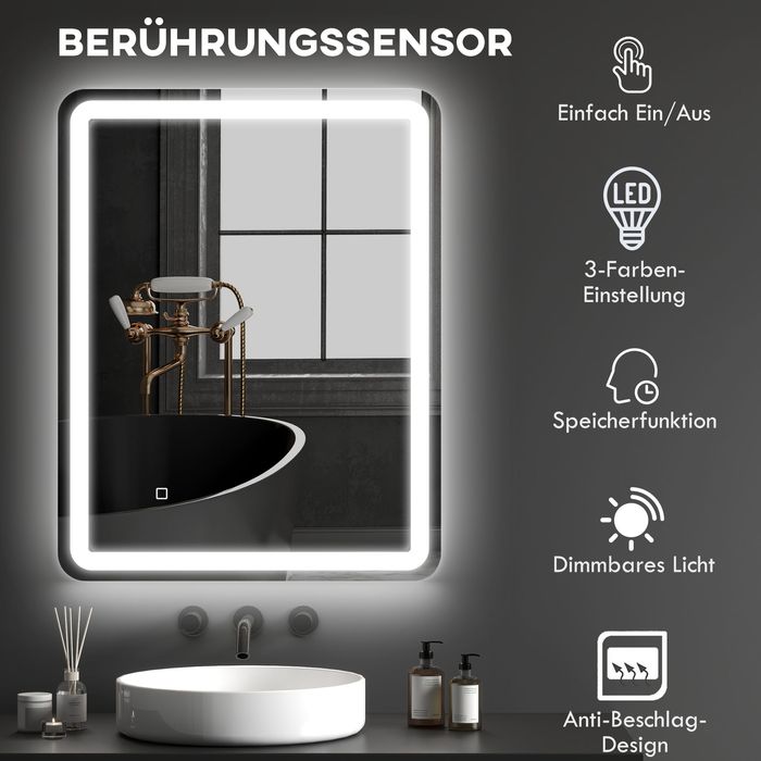 Badezimmerspiegel, beleuchtet, Touch-Steuerung, beschlagfrei, dimmbar, 3 Lichtfarben, 70x90, Silber