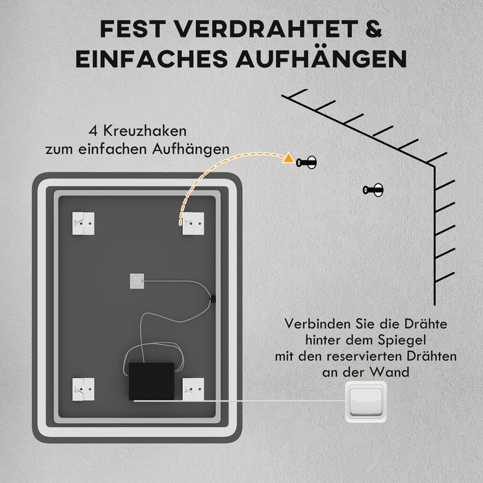 - Touch-Kontrolle für einfache Bedienung: Aktivieren Sie mit dem praktischen Touch-Sensor die Beleuchtung, wechseln Sie zwischen verschiedenen Lichtfarben und -helligkeiten oder nutzen Sie die Anti-Beschlag-Funktion des Wandspiegels. Zusätzlich merkt sich die integrierte Speicherfunktion Ihre letzte Einstellung, sodass Sie jedes Mal Ihre bevorzugte Beleuchtung geniessen können