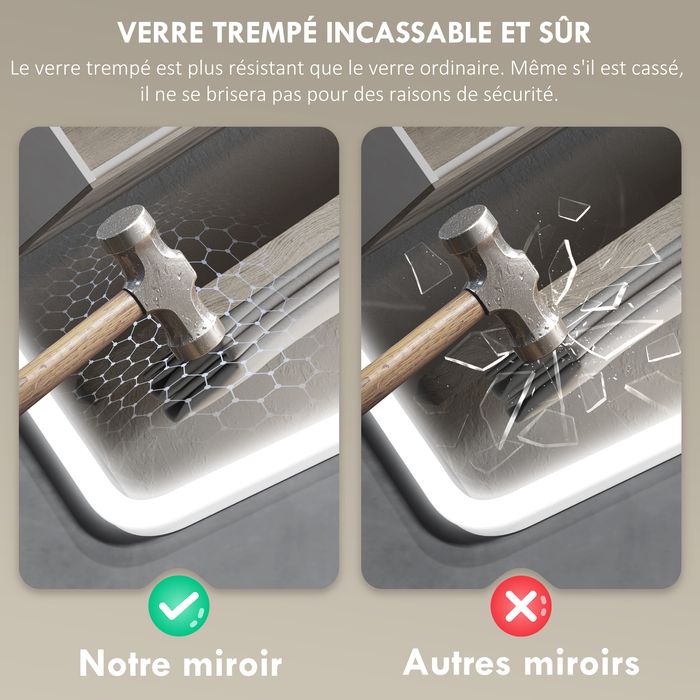 - HD UND BRUCHSICHER: Geniessen Sie eine klare und unverzerrte Reflexion dank des gehärteten Glases, das sicherer ist als normales Glas. Im Falle eines Bruchs zerfällt es in ungefährliche Stücke. Kompatibel mit Wand- und Touch-Steuerungen, ist dieser beleuchtete Badezimmerspiegel auch mit einem Kabel für den direkten Anschluss ausgestattet.
