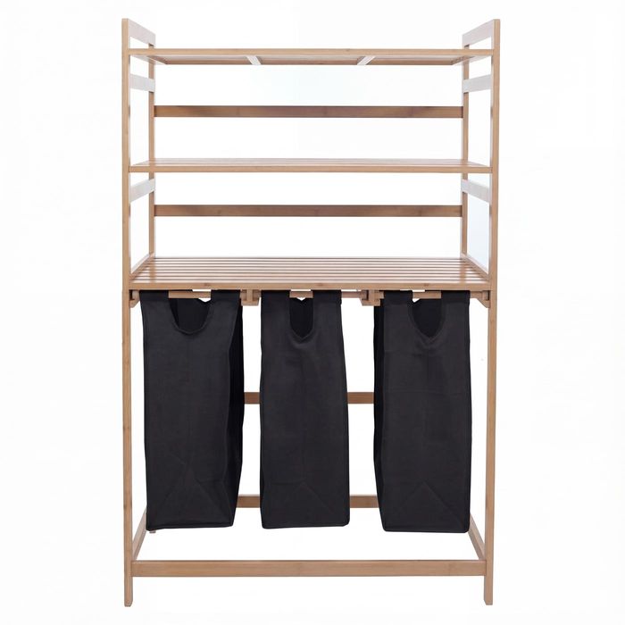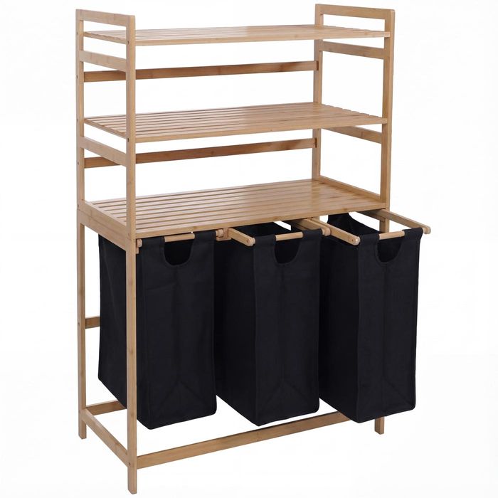 Dieses hochwertige Wäscheregal mit integriertem Wäscheorganizer vereint durchdachte Funktionalität mit einem zeitlosen Design und ist die ideale Lösung für eine strukturierte und platzsparende Wäscheaufbewahrung. Drei herausnehmbare Wäschesäcke mit jeweils 45 Litern Kapazität ermöglichen es, die Wäsche bequem und übersichtlich nach Farben, Materialien oder Waschtemperaturen zu trennen und zu sortieren. So bleibt der Haushalt organisiert und der nächste Waschgang ist optimal vorbereitet. Ergänzt wird das System durch drei offene Ablageflächen, die zusätzlichen Stauraum für Handtücher, Pflegeprodukte, Waschmittel oder dekorative Elemente bieten. Das freistehende Standregal überzeugt durch sein platzsparendes Design und passt perfekt ins Badezimmer, Schlafzimmer oder in den Hauswirtschaftsraum. Der stabile Rahmen aus Bambus sorgt für einen sicheren Stand und verleiht dem Möbelstück eine natürliche Optik. Dank der offenen Konstruktion ist eine gute Belüftung der Wäsche gewährleistet, wodurch unangenehme Gerüche vermieden werden. Das moderne und zugleich zeitlose Design fügt sich harmonisch in viele Einrichtungsstile ein und macht das Wäscheregal zu einer praktischen wie auch optisch ansprechenden Aufbewahrungslösung. Vielseitig einsetzbar, funktional durchdacht und ideal für alle, die ihre Wäsche effizient sortieren und stilvoll aufbewahren möchten. Lieferung erfolgt ohne Dekoration.