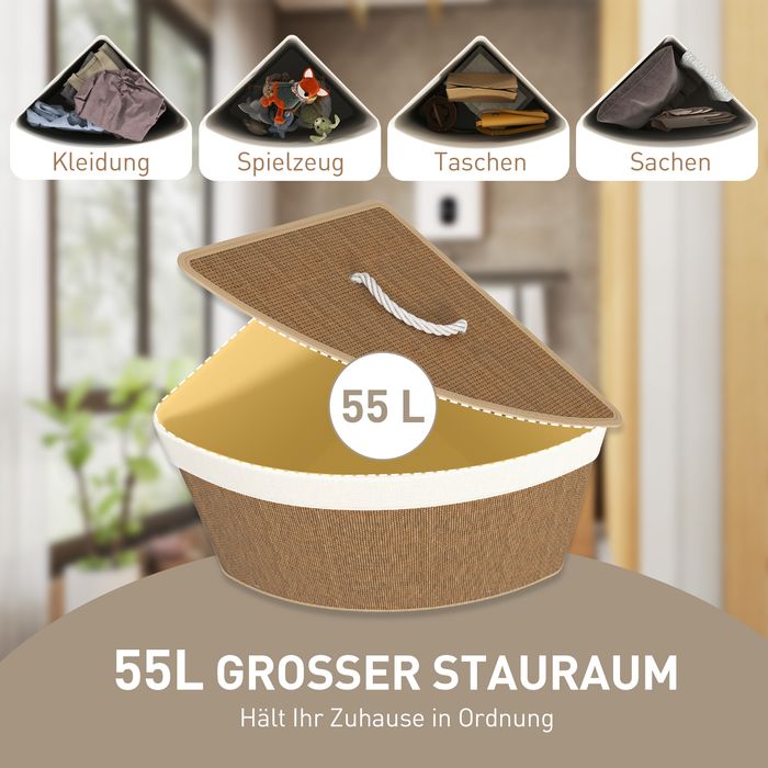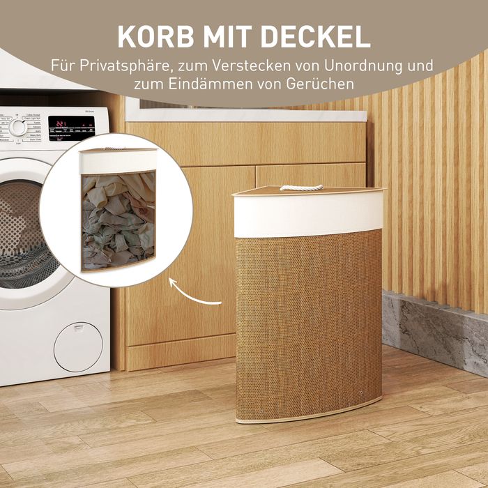 Wäschekorb im Eckdesign, Bambusgeflecht, 55 Liter, Stoffbeutel, Metallrahmen, Braun