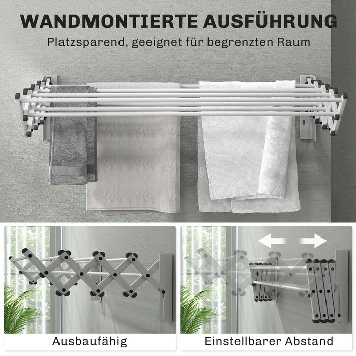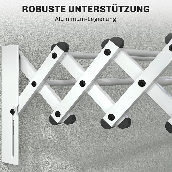 Verwandeln Sie Ihre Umgebung mit dem HOMCOM Wandmontage Wäscheständer, die Modernität und Funktionalität perfekt kombiniert. Dieser elegante, wandmontierte Wandtrockner passt sich nicht nur nahtlos Ihrer Einrichtung an, sondern passt sich auch flexibel Ihren Anforderungen an und eignet sich für drinnen und draussen. Aus stabiler, pulverbeschichteter Aluminiumlegierung gefertigt, ermöglicht er das Aufhängen von bis zu 8 Handtüchern und verbindet Komfort mit Stil.