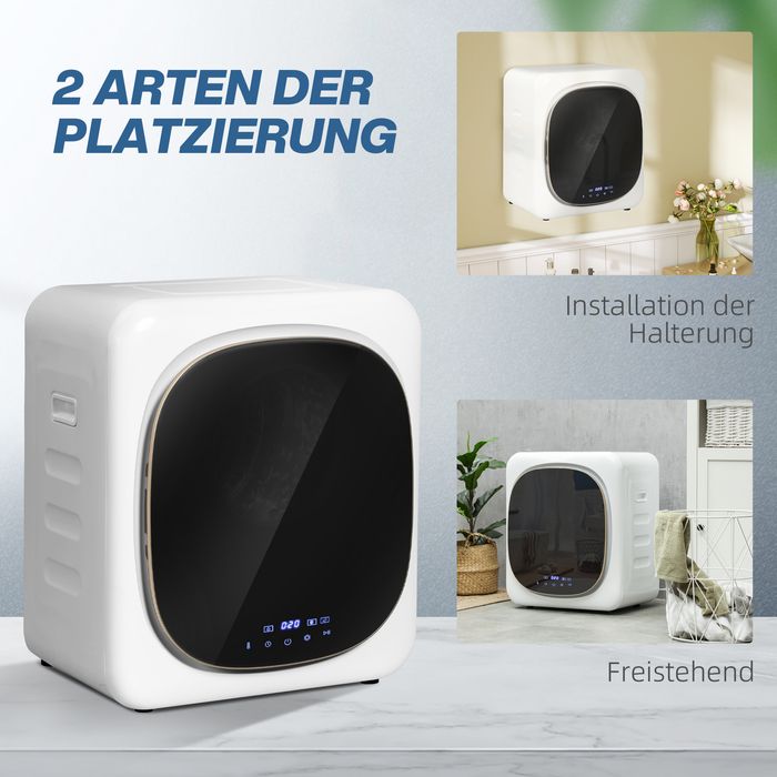 - Flexible Installation: Dieser kleine Trockner kann freistehend aufgestellt, wandmontierbar oder mittels einer Halterung zusammen mit der Waschmaschine gestapelt werden. Dank seiner kompakten Grösse passt er flexibel in verschiedene Räume und kompakte Wohnbereiche