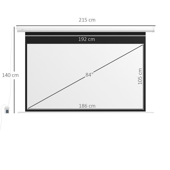 - Abmessungen: Gesamtabmessungen: 215L x 8T x 140H cm, Leinwandabmessungen: 186L x 105H cm, Verhältnis: 16:9. Diagonale: 84"