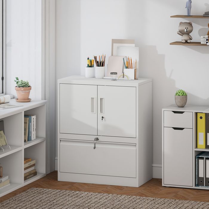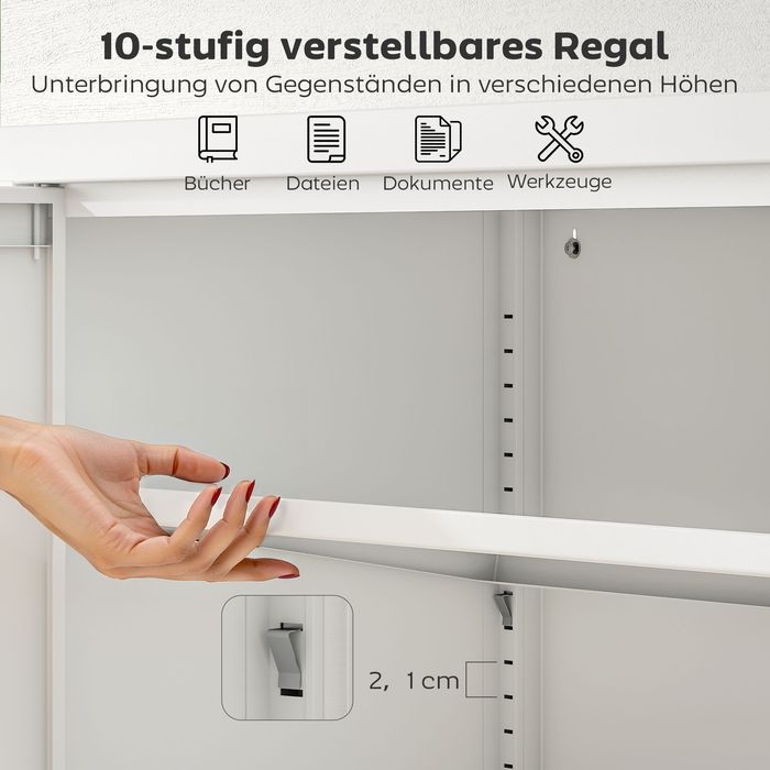 - Flexibler Stauraum: Hinter zwei Türen erwartet Sie ein Regal mit 10 Anpassungsmöglichkeiten in der Höhe. Passen Sie es an oder entfernen Sie es, um Bücher, Bürobedarf, persönliche Gegenstände oder Werkzeuge perfekt in Ihrem Aktenschrank zu platzieren.