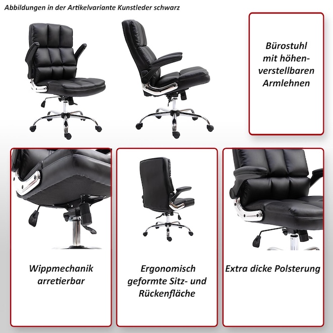 Die Armlehnen dieses Chefsessels sind hoehenverstellbar und gepolstert. So kannst du sie individuell auf deine Sitzposition einstellen und Schultern sowie Nacken entlasten.