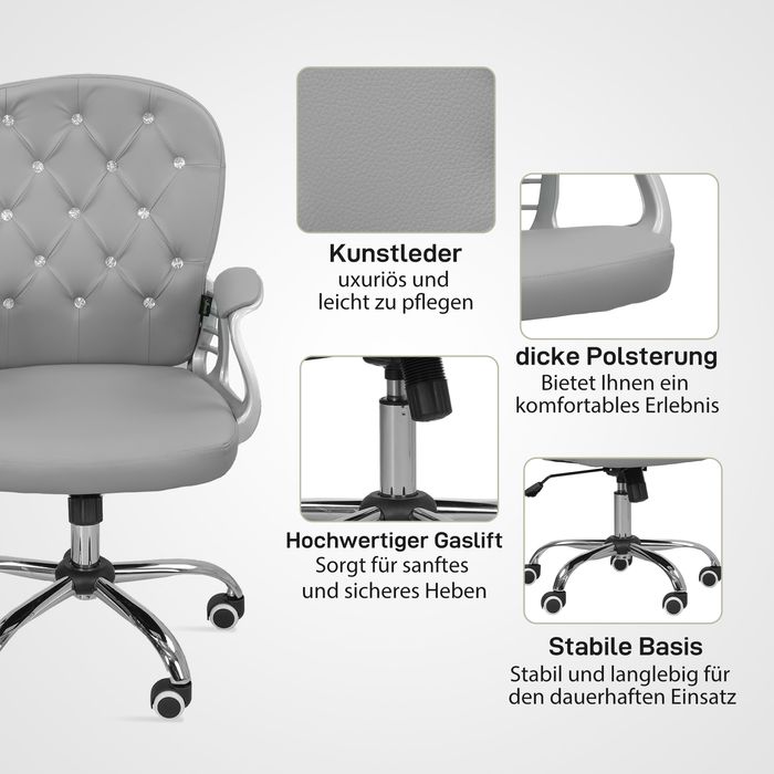 Entdecken Sie den idealen Begleiter für Ihr Home-Office: Unser moderner Bürostuhl kombiniert stilvolles Design mit erstklassigem Komfort. Die mittelhohe Rückenlehne und der weiche Bezug in Kunstlederoptik, verziert mit einem dekorativen Kristall und Knopfheftung, bieten optimalen Sitzkomfort. Die robusten, verzinkten Beine garantieren Stabilität und freie Mobilität. Dieser vielseitige Schreibtischstuhl fügt sich nahtlos in jedes Ambiente ein – ob Schlafzimmer, Wohnzimmer oder Büro.