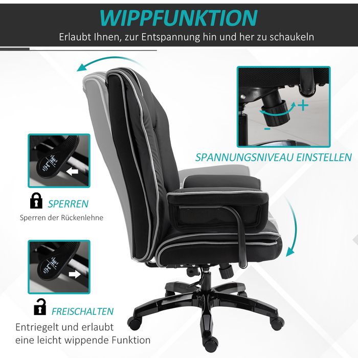 - Komfort und Mobilität: Der mit Schaumstoff gepolsterte Sitz, die Rückenlehne, die Kopfstütze und die Armlehne bieten Ihnen grossen Komfort. Und er ist mit PU-Leder bezogen, das weich und abriebfest ist. Mit 5 in mehrere Richtungen drehbaren Rädern lässt sich dieser Stuhl problemlos von Raum zu Raum bewegen.