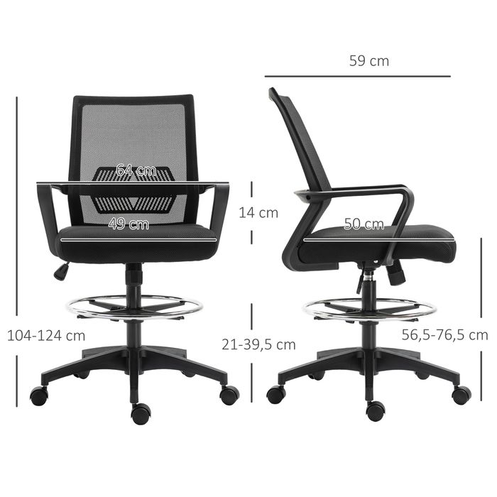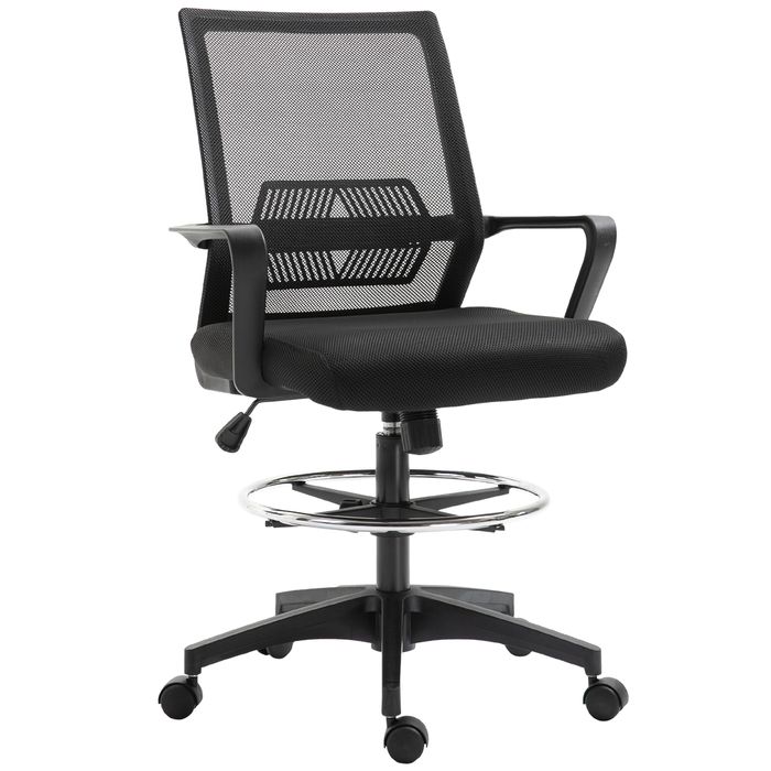 Leiden Sie unter Unbehagen an Ihrem Stehpult? Lange Sitzungen auf einem herkömmlichen Stuhl führen oft zu Schwitzen und unbequemen Beinhaltungen, was die Konzentration beeinträchtigt. Der Vinsetto Zeichenstuhl, entworfen für höhere Arbeitsplätze, mit verstellbarer Höhe und Fussstütze, bietet individuellen Komfort. Das luftige Mesh-Rücken sorgt für Kühlung. In diesem hohen Bürostuhl finden Sie Ihren produktiven Rhythmus, komfortabel und gut unterstützt.