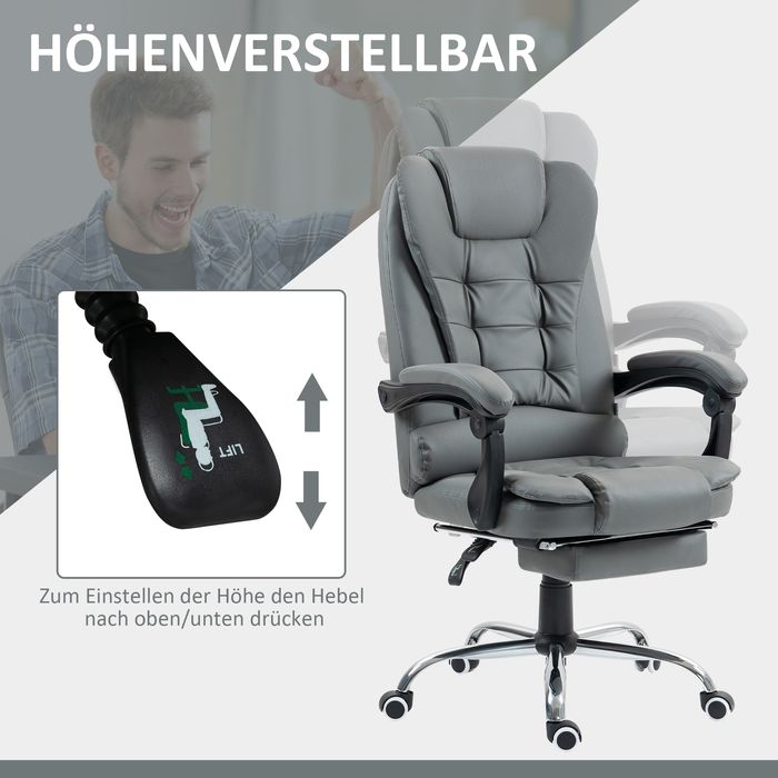 Bürostuhl mit Fussstütze, Schreibtischstuhl, verstellbare Rückenlehne, höhenverstellbar, Grau+Schwarz+Silber