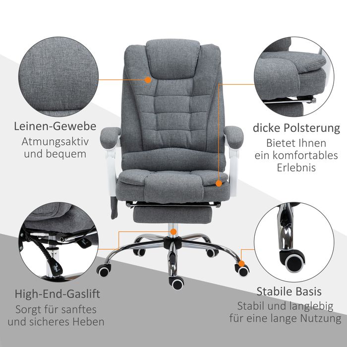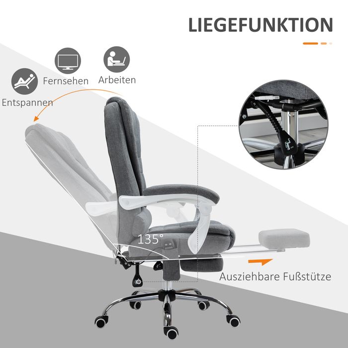 Verwandeln Sie Ihr Büro in eine Oase der Entspannung mit dem Vinsetto Bürostuhl mit Massagefunktion. Dieser Bürosessel ist mit weichem Stoff bezogen und kombiniert stilvollen Komfort mit Funktionalität. Ausgestattet mit sechs Heizmassagepunkten, vier im Rücken- und zwei im Sitzbereich, die sich einfach per Fernbedienung steuern lassen, bietet er optimale Entspannung. Zusätzlich ermöglichen die bis zu 135° neigbare Rückenlehne und die manuelle Fussstütze eine perfekte Liegeposition.