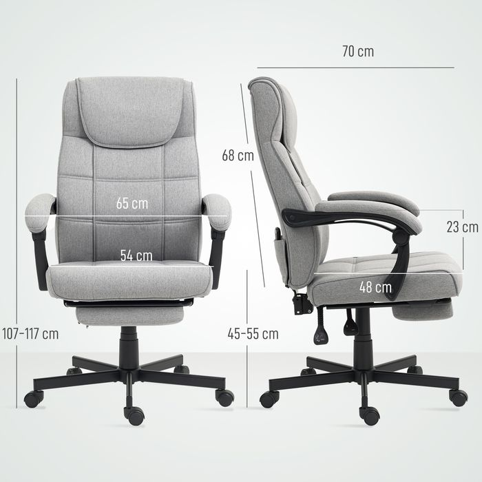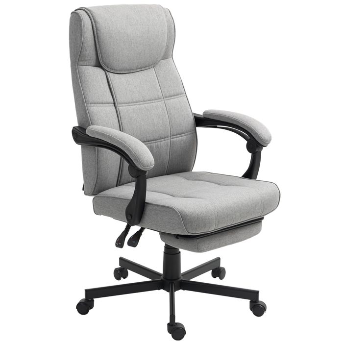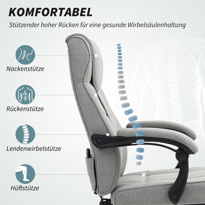 Geniessen Sie stilvolle Entspannung im HOMCOM ergonomischen Bürostuhl mit fünf entspannenden Massageprogrammen und vier speziellen Punkten an Nacken und Taille für maximale Erholung. Der atmungsaktive Stoff im Leinen-Look und die dick gepolsterte Sitzfläche des Chefsessels bieten höchsten Komfort. Rückenlehne und Fussstütze des Bürosessels lassen sich separat verstellen, einfach zu bedienen mit der praktischen Kabel-Fernbedienung.