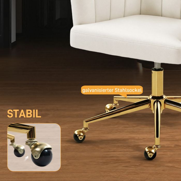 - Moderne Ästhetik: Der samtartige Stoff, die präzisen Nähte, die goldfarbene Basis und die kugelförmigen Rollen dieses Schreibtischstuhls kreieren eine ruhige, elegante Ausstrahlung, die jedes Homeoffice oder jede Ankleidezone bereichert