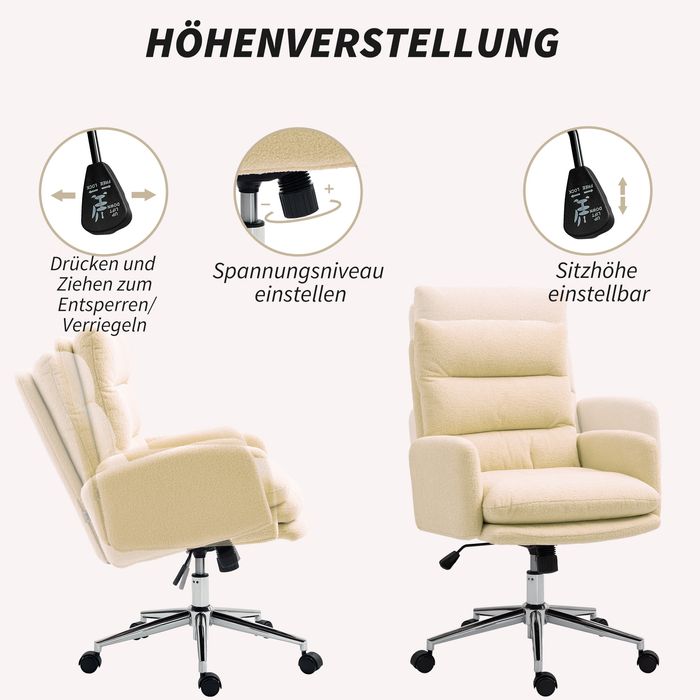 Erleben Sie mit dem HOMCOM Bürostuhl eleganten Komfort, der modernes Design mit luxuriösem Lammwolle kombiniert. Die gepolsterten Armlehnen und die weiche Rückenlehne, gefüllt mit dickem, mitteldichtem Schaumstoff, bieten unübertroffene Unterstützung. Dieser Bürostuhl verleiht jedem Arbeitsbereich, ob beim Bewegen im Studierzimmer oder Anpassen der optimalen Höhe, eine elegante Note.