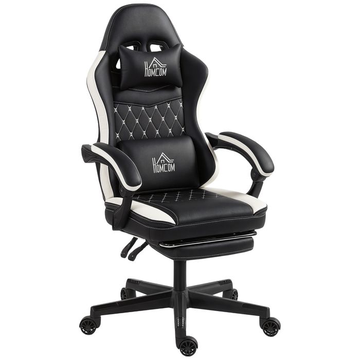 Gaming-Stuhl mit Fussstütze, Kopfstütze & Kissen, Kunstleder, Metall, Kunststoff, Schwarz+Weiss