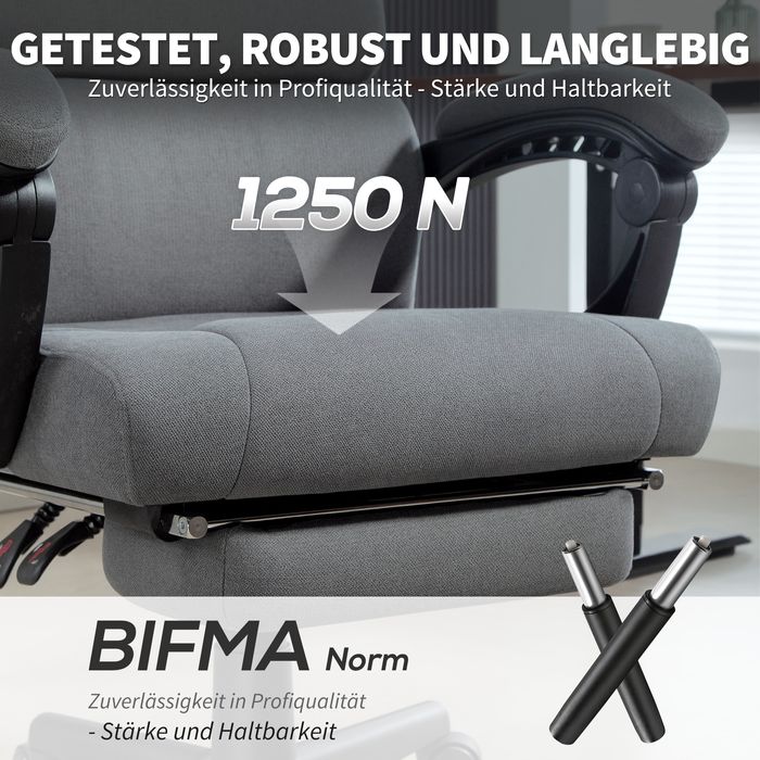 - Verstellbare Neigung und Höhe: Mit einer bis zu 135° arretierbaren Rückenlehne und einer ausziehbaren Fußstütze ausgestattet, ideal für eine erholsame Pause oder zum Lesen. Die Sitzhöhe des Computerstuhls lässt sich individuell anpassen