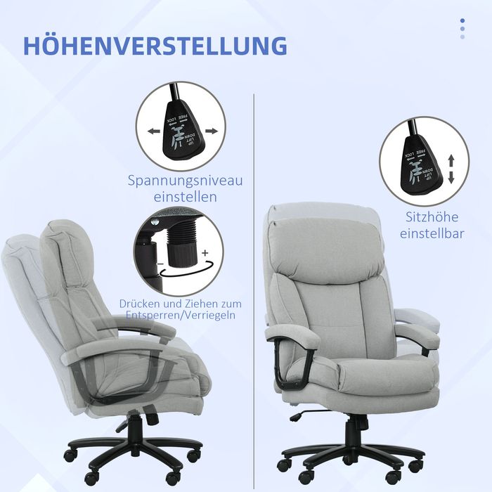 Entdecken Sie den HOMCOM Schreibtischsessel: Perfekt für grosse und kräftige Personen geeignet, trägt seine robuste Konstruktion bis zu 200 kg. Erleben Sie höchsten Komfort durch die dicke Schaumstoffpolsterung und den samtweichen Stoff in Leinenoptik. Neigen und schaukeln Sie mühelos, während Sie die Sitzhöhe für optimale Arbeitsbedingungen flexibel einstellen. Dieser PC Stuhl vereint Komfort mit praktischer Funktionalität!