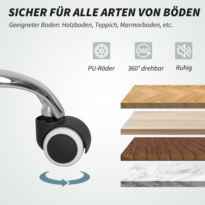 - Passen Sie Ihre Haltung an: Passen Sie diesen Bürostuhl mit Massagefunktion an Ihre bevorzugte Sitzhöhe an, sodass Sie ihn an Ihren Schreibtisch und Ihre Sitzposition anpassen können. Die schwenkbaren Kunstlederrollen sind für alle Bodenbeläge geeignet