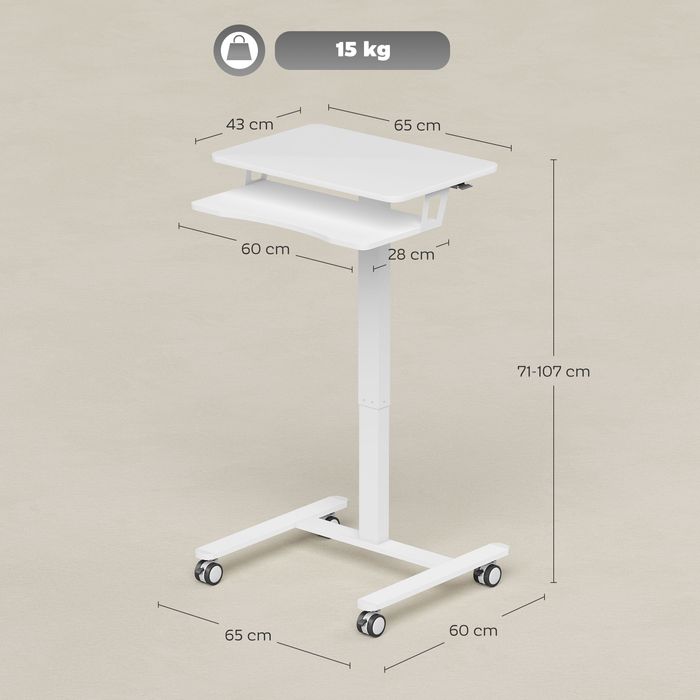 - Produktinformationen zum Schreibtisch: Gesamtabmessungen: 65Bx60Tx71-107H cm, Belastbarkeit: 15 kg. Montage erforderlich.