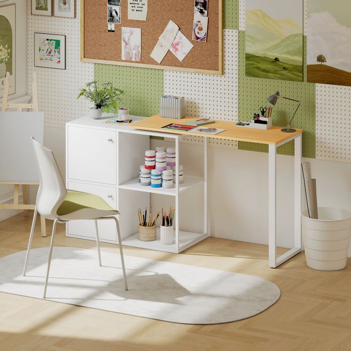 - Offene und geschlossene Aufbewahrung: Mit zwei geschlossenen Schränken und zwei offenen Regalen bietet unser Bürotisch ausreichend Stauraum für Ihre wichtigen Unterlagen und die Möglichkeit, Dekorationsstücke ansprechend zu präsentieren.