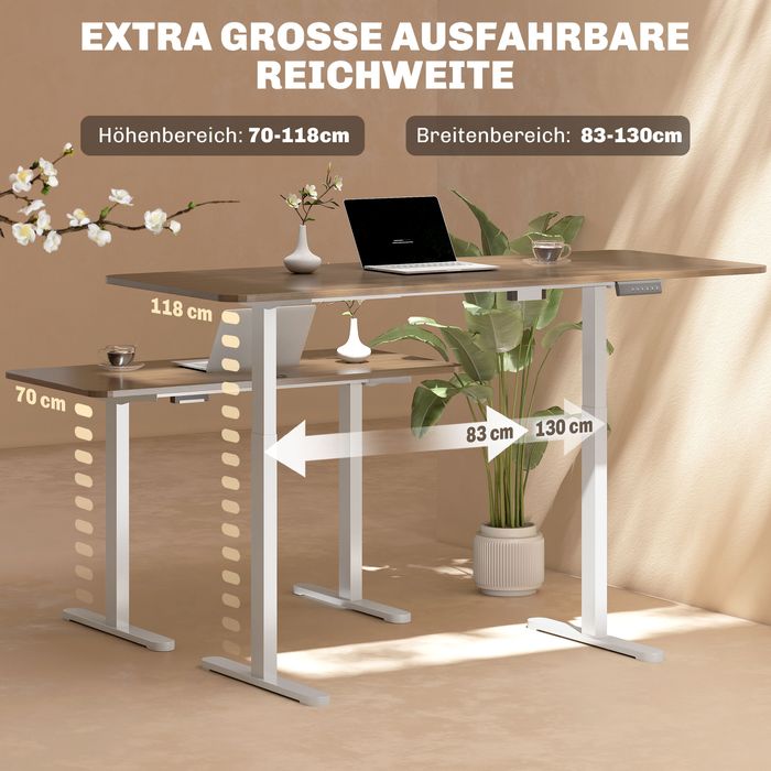 Optimieren Sie Ihren Arbeitsbereich mit diesem höhenverstellbaren Schreibtischgestell! Justieren Sie mühelos von 70 cm bis 118 cm in der Höhe und 83 cm bis 130 cm in der Breite. Dank der kraftvollen Doppelmotoren wechseln Sie die Einstellungen schnell und geräuschlos und profitieren von drei praktischen Speicherfunktionen. Dieses Schreibtischgestell bietet mit Stil und Funktionalität Unterstützung für Ihren Arbeitstag.