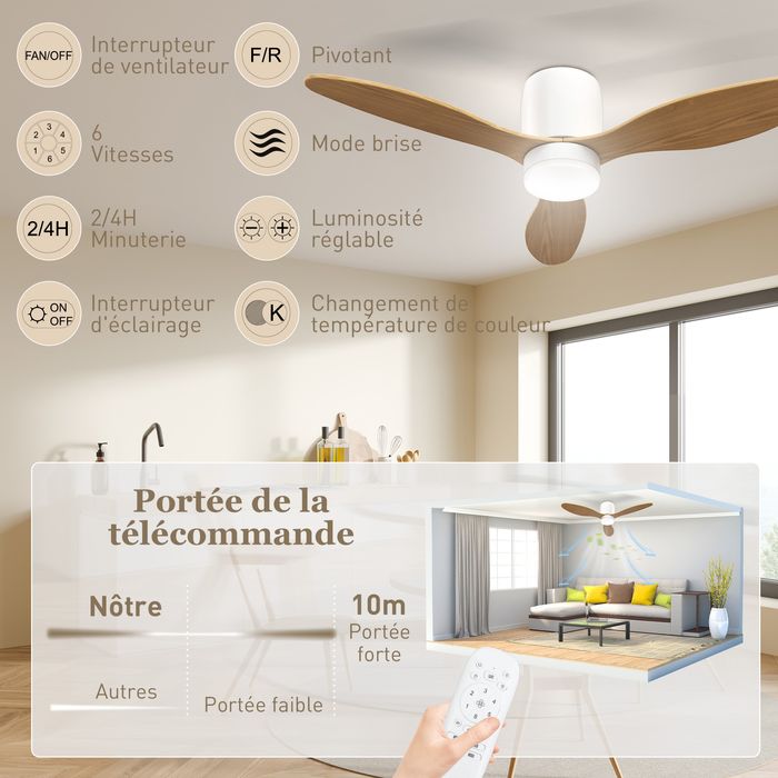 Deckenventilator Licht, 3 Farben, 6 Geschwindigkeiten, Fernbedienung, Timer, Natur