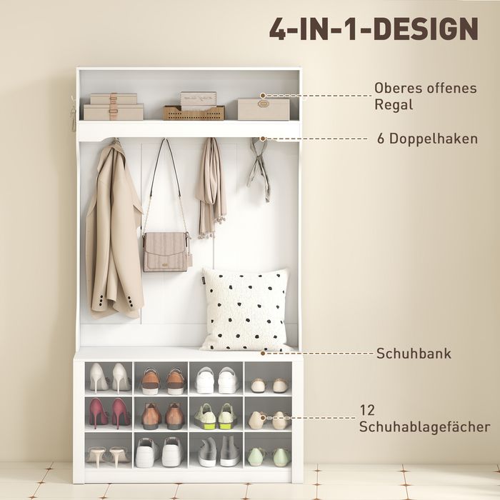 - Kombiniert ein offenes Regal, eine Bank, sechs Haken und 12 Schuhfächer zur Organisation Ihres Eingangsbereichs