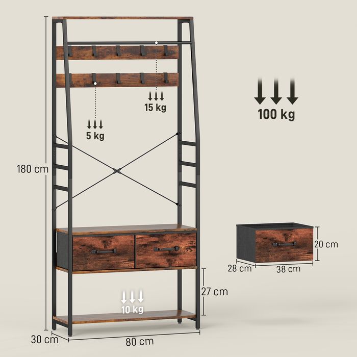 Garderobe, Schuhregal, Mantelständer, Haken, Stoffschubladen, Metall, Braun