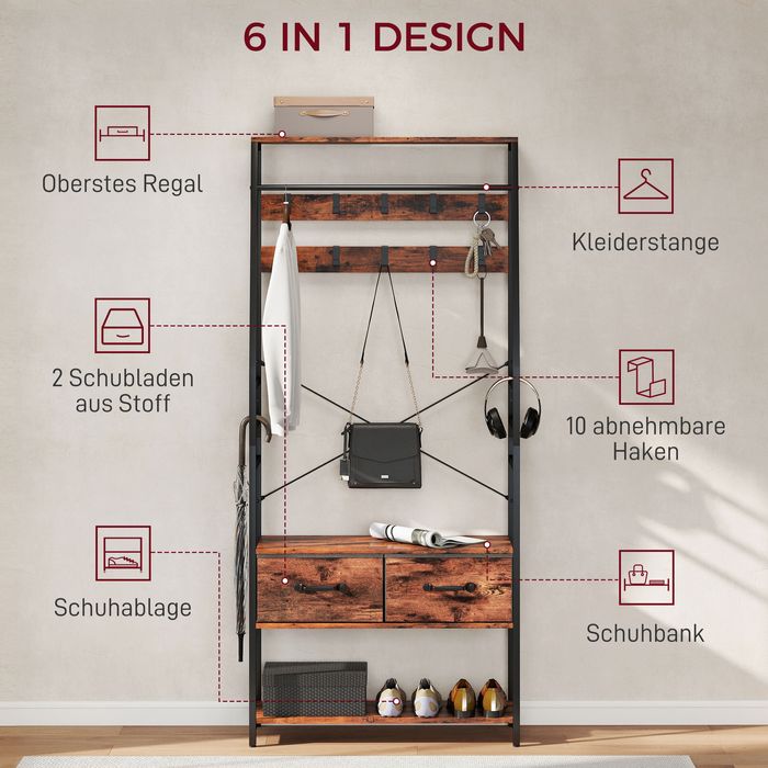 - 6-in-1-Design: kombiniert ein oberes Regal, eine Kleiderstange, 10 Kleiderhaken, eine Schuhbank, zwei Stoffschubladen und ein Schuhregal
