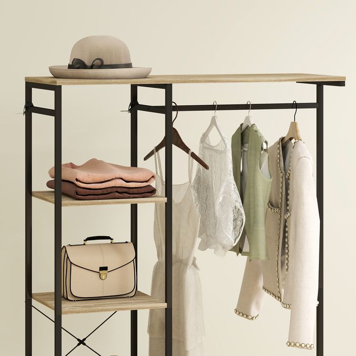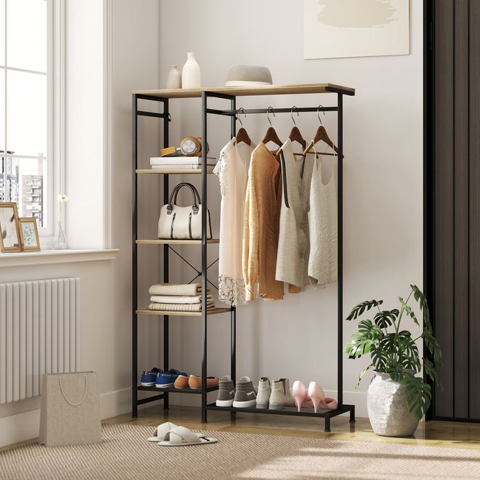 Garderobenständer, Kleiderständer mit Kleiderstange, Schuhregal Ablage Kippschutz Eiche