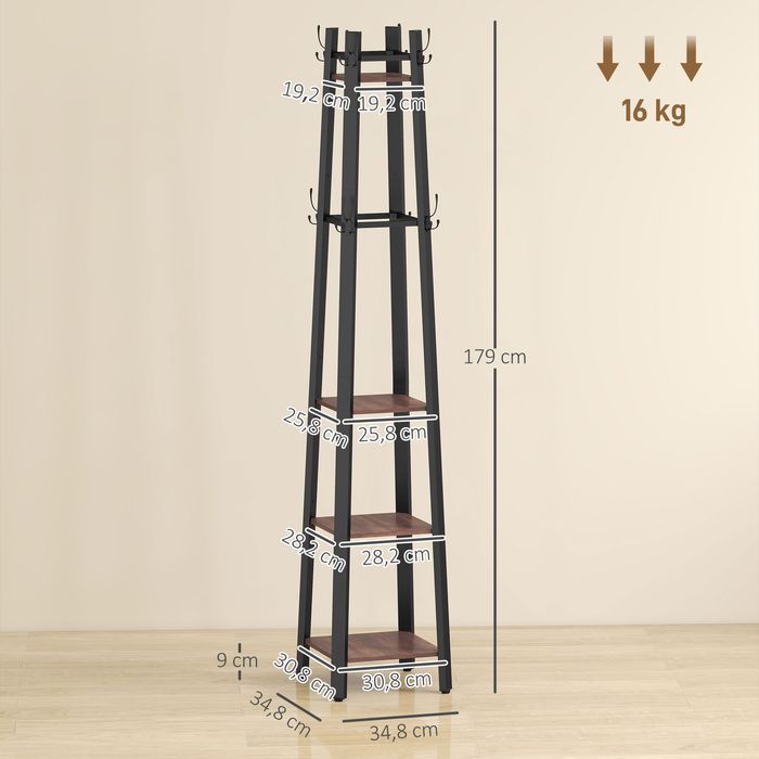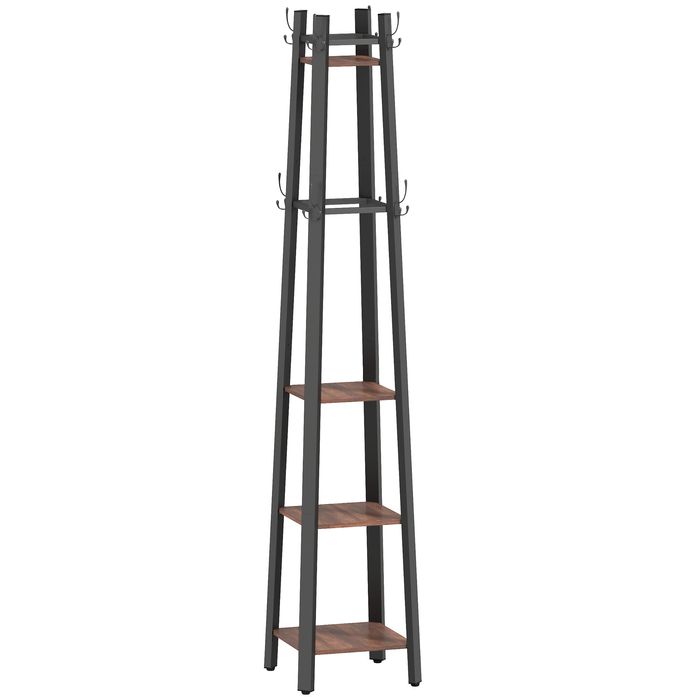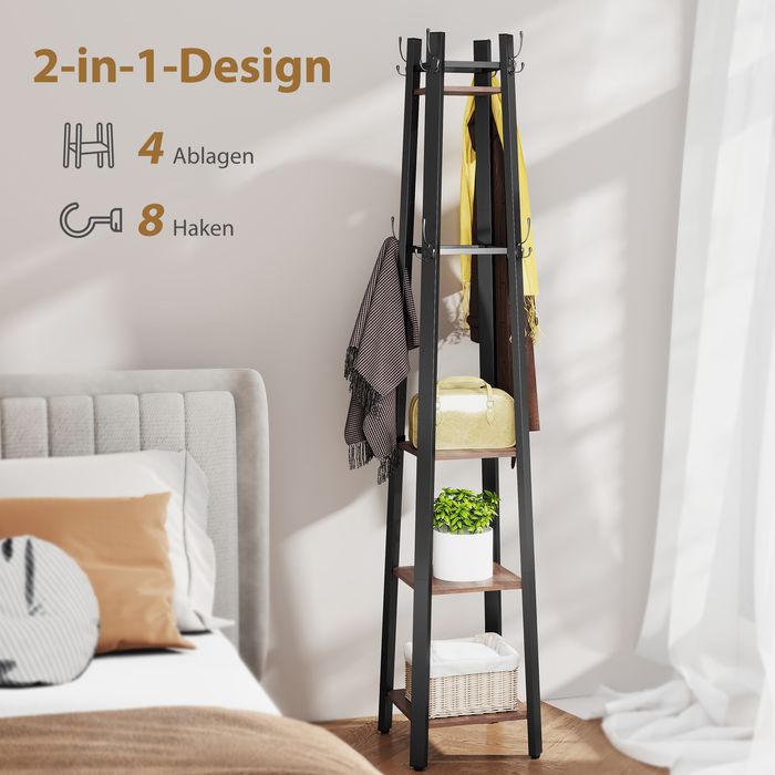Garderobenständer mit 4 Ebenen, freistehender Kleiderständer, 8 Haken, 4 Regale, Industrie-Stil, Metall, Spanplatte, Braun