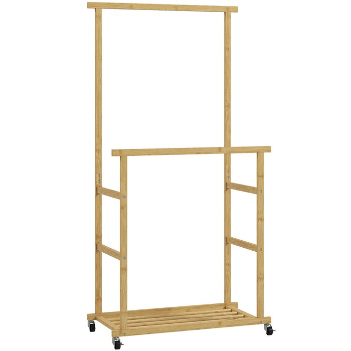 Entdecken Sie den Kleiderständer auf Rollen: Ein elegantes 3-in-1 Design mit zwei Kleiderstangen für Ihre Garderobe und einem grossen Schuhregal unten. Mühelos auf glatten Rollen zu bewegen und einfach zu fixieren. Aus schickem Bambus gefertigt, bereichert der Garderobenständer jeden Raum als platzsparende, stilvolle Lösung.