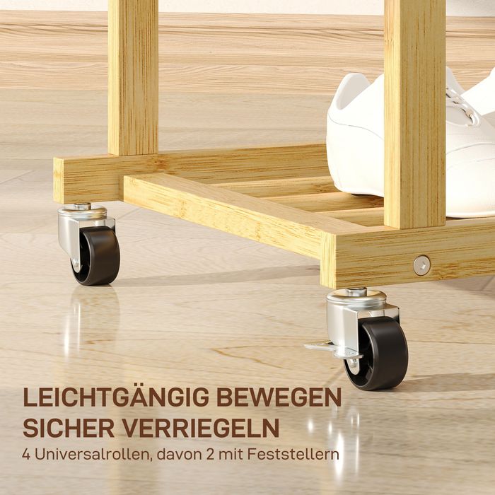 Kleiderständer, Rollen, Kleiderstange, Schuhablage, Bambus, 80x40x160cm, Natur