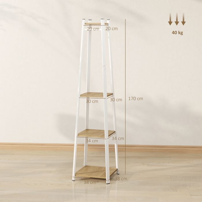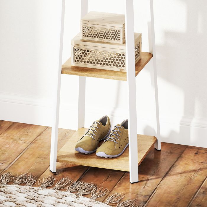 Erleben Sie den stilvollen HOMCOM Kleiderständer, perfekt zum Aufhängen Ihrer Garderobe. Ausgestattet mit 8 Doppelhaken für Mäntel und Schals sowie einem dreistufigen Regal für Deko oder Pflanzen, ist er ein echter Platzsparer für jede Ecke. Sein elegantes, trapezförmiges Design passt ideal in Flure oder Wohnräume und macht das Aufräumen zum Kinderspiel.