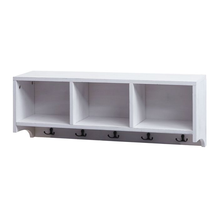 - Das Regal im angesagten Shabby-Look passt perfekt in jeden Eingangsbereich oder Schlafzimmer. Mit den fünf Haken bietet dieses Wandregal ausserdem genügend Platz für Ihre Kleidungsstücke, es bleiben keine Wünsche offen.