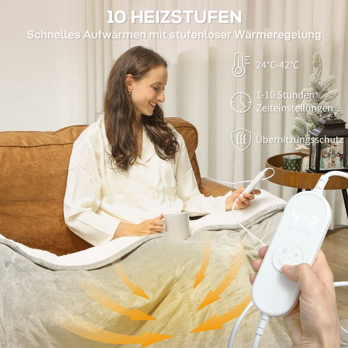 Heizdecke 180 x 130 cm Elektrische Wärmedecke mit 10 Heizstufen, 10 Stunden Timer Überhitzungsschutz LED Anzeige