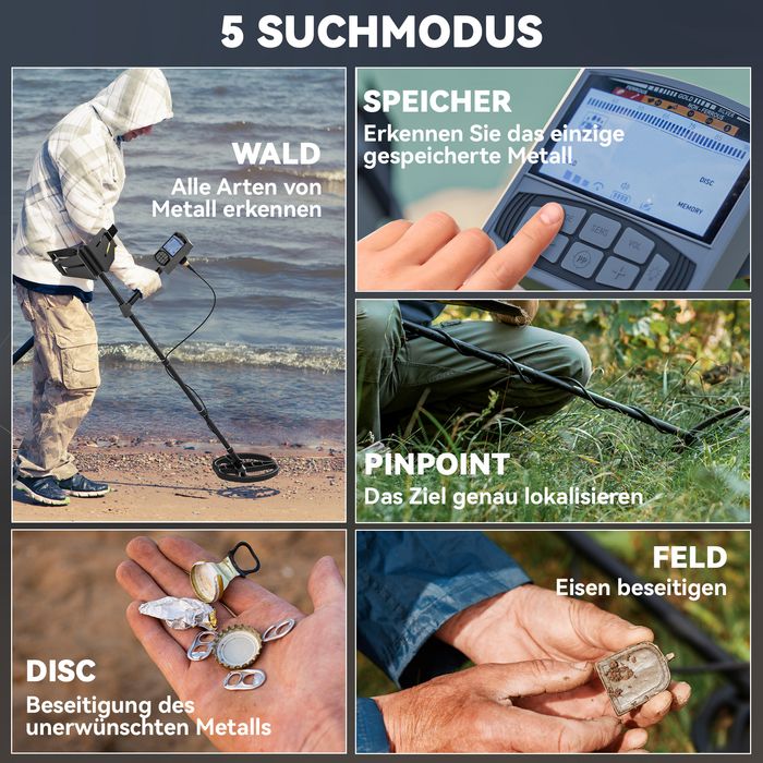 - ✔ Fünf Detektionsmodi für die gezielte Suche nach spezifischen Metallen - Aluminium, Gold, Silber, Nickel, Zink und Kupfer