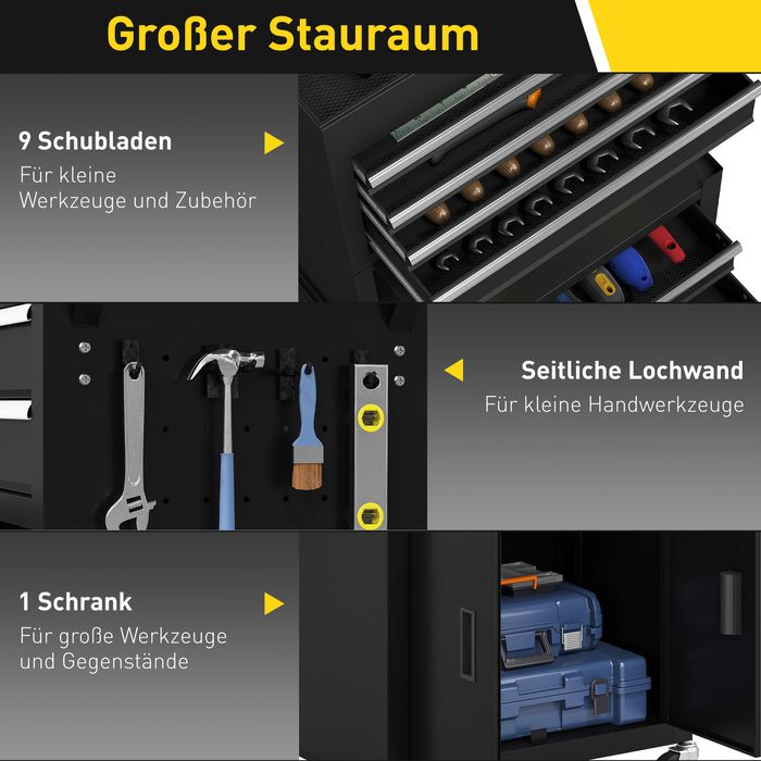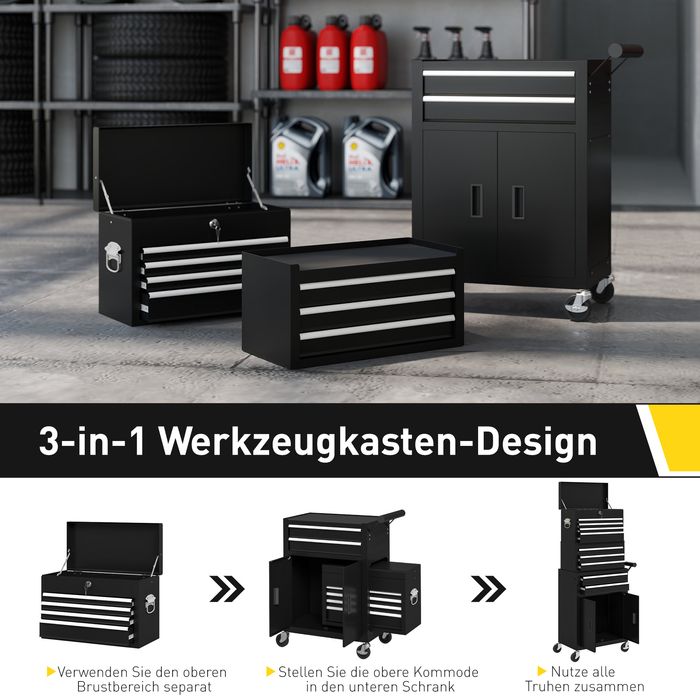 3in1 Werkzeugkiste, 9 Schubladen, Räder, verschliessbarer, Stahl, Schwarz