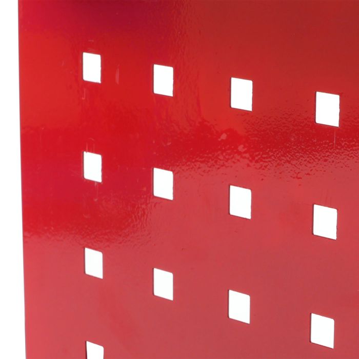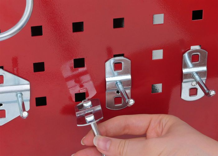 - Besonders praktisch sind die Befestigungshaken, diese können individuell an den Seitenwänden mit Lochraster angebracht werden. Dank seines Handgriffs kann der Werkzeugwagen problemlos gelenkt werden.