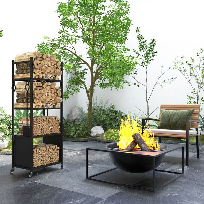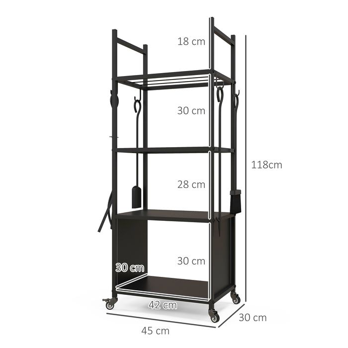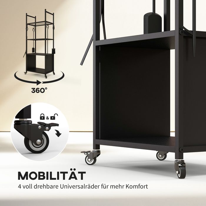 4-Ebenen-Feuerholzregal, Räder und 4 Werkzeugen, Metall für den Innen- und Aussenbereich, Schwarz