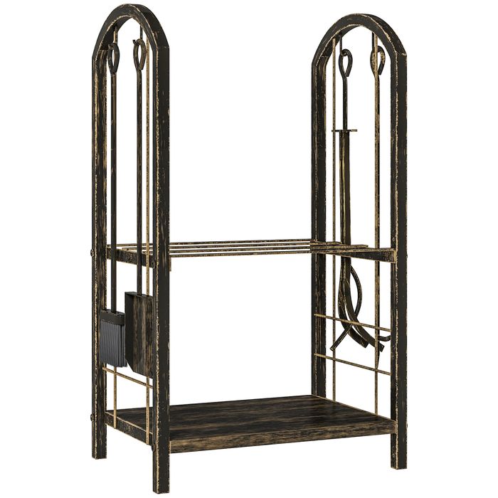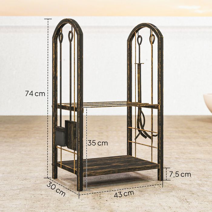 Kaminholzregal für innen 43 x 30 x 74cm 2 Ebenen Brennholzregal mit 4 Kaminwerkzeug, Haken