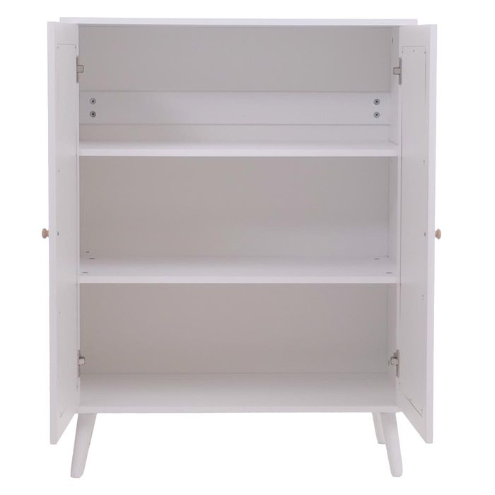 Das Highboard verfügt über zwei Türen und drei geräumige Staufächer, die reichlich Platz für Ihre Utensilien bieten, von Geschirr über Bücher bis hin zu Dekorationsartikeln. Die Staufächer sind dabei so konzipiert, dass sie Ordnung und Übersicht leicht machen, und die stabilen Füsse aus Massivholz gewährleisten eine sichere und feste Position. Ob im Wohnzimmer, Esszimmer oder in der Diele, dieses Sideboard fügt sich nahtlos in jede Raumgestaltung ein und setzt stilvolle Akzente.