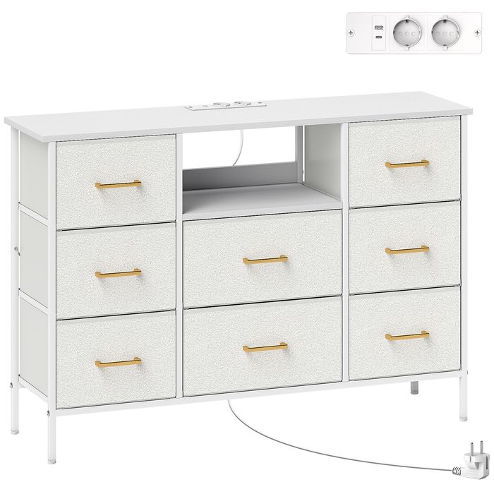 Kommode, 8 Schubladen, Steckdosenleiste, Stahlrahmen, Cremeweiss