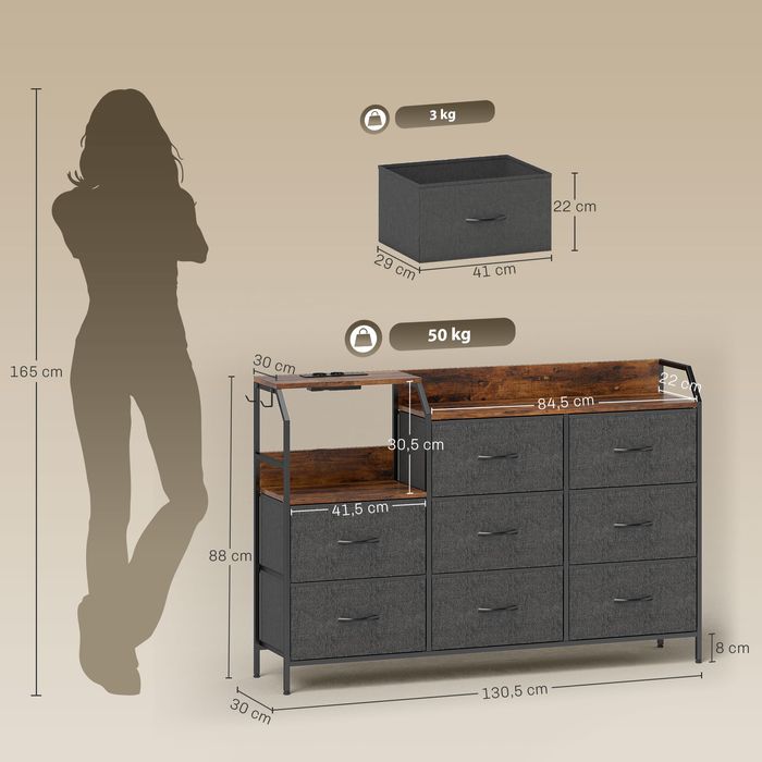Kommode, 8 Schubladen Stoff, Stahlrahmen, Ladestation, Rustikal-Braun+Schwarz
