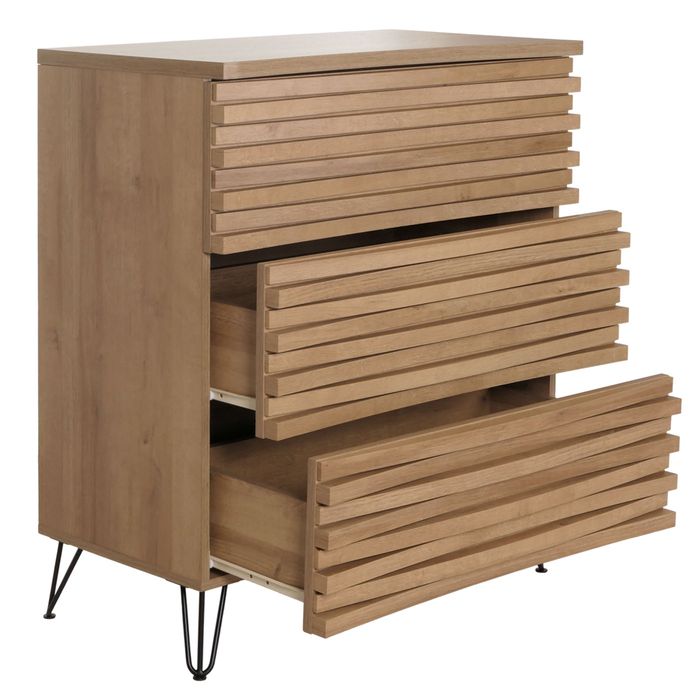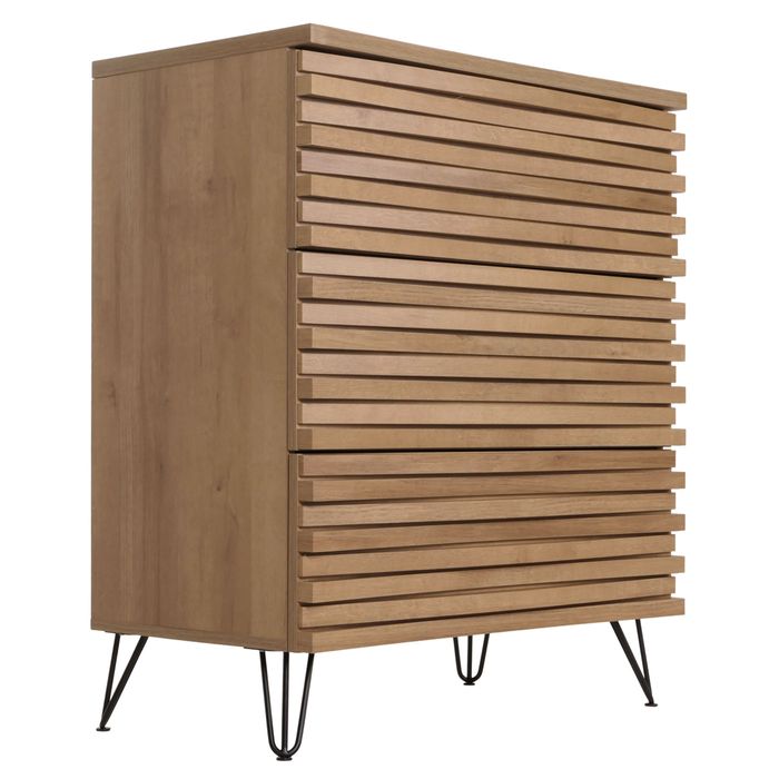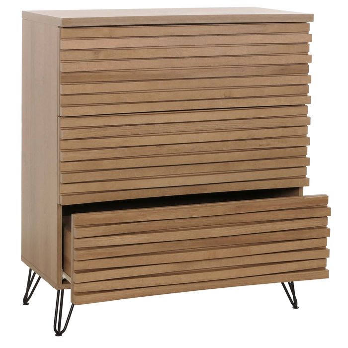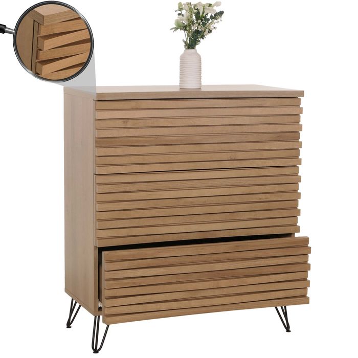 - Die Kommode bietet mit ihren drei geräumigen Schubladen ausreichend Platz für Ihre Utensilien. Diese sind ideal, um alles von Büchern über Geschirr bis hin zu Multimedia-Zubehör stilvoll und geordnet aufzubewahren.
