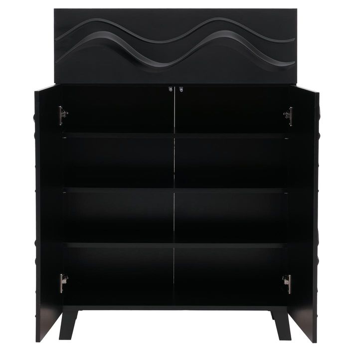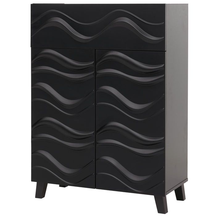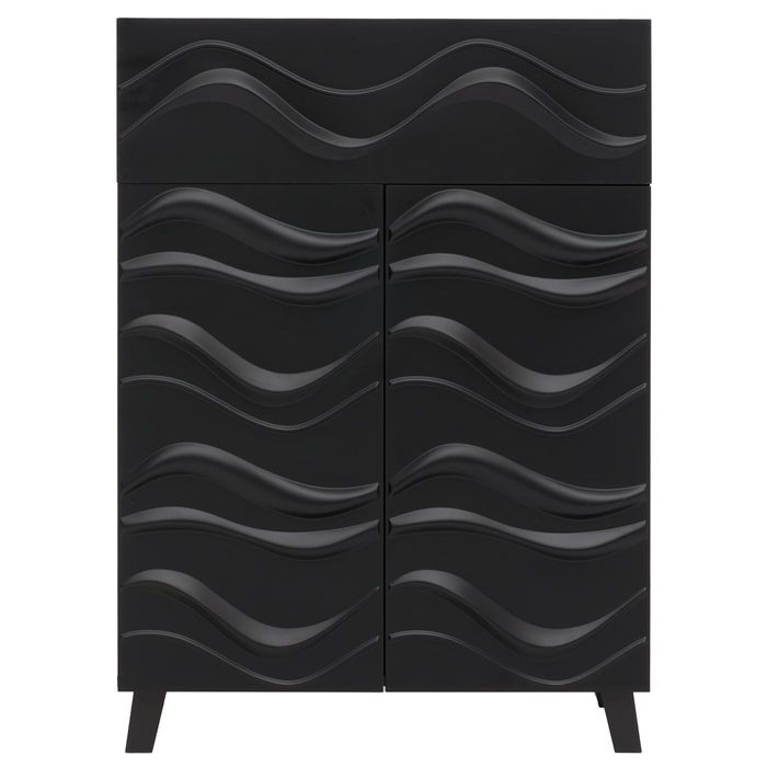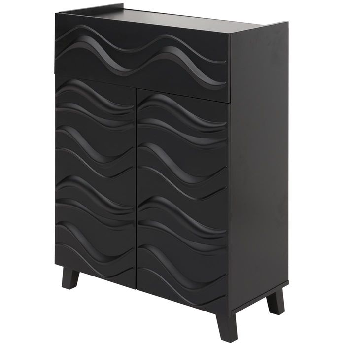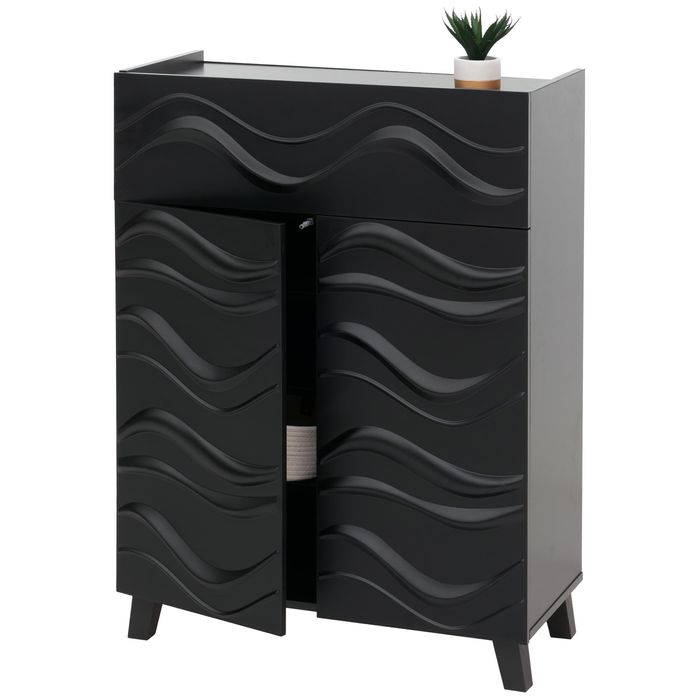 Diese stilvolle Kommode verbindet modernes Design mit hoher Funktionalität und wird zum Highlight in jedem Wohnraum. Die Oberfläche im innovativen 3D-Wellen-Design sorgt für eine aussergewöhnliche Optik und verleiht der Kommode eine edle und einzigartige Ausstrahlung. Dank der Push-to-open-Funktion lassen sich die Türen mühelos öffnen und schliessen, was nicht nur praktisch ist, sondern auch für ein nahtloses, minimalistisches Erscheinungsbild sorgt. Der grosszügige Stauraum hinter den Türen bietet Platz für alles, was Sie ordentlich und griffbereit verstauen möchten. Vier Regalböden ermöglichen eine optimale Organisation Ihrer Gegenstände, während die integrierte Schublade zusätzlichen Platz für kleinere Utensilien schafft. Die praktische Ablagefläche oben bietet Raum für dekorative Akzente oder Alltagsgegenstände wie Lampen, Bücher oder Bilderrahmen. Die mit robustem PVC versehenen Kanten garantieren eine hohe Langlebigkeit und machen die Kommode besonders widerstandsfähig gegen Abnutzung im Alltag. Egal ob im Wohnzimmer, Schlafzimmer oder Flur – diese Kommode passt sich Ihrem Stil an und ergänzt Ihre Einrichtung perfekt. Holen Sie sich mit dieser eleganten Kommode nicht nur ein praktisches Möbelstück, sondern auch ein Design-Highlight, das mit Qualität, Funktionalität und Ästhetik überzeugt. Perfekt für alle, die Ordnung lieben, ohne auf Stil verzichten zu wollen.