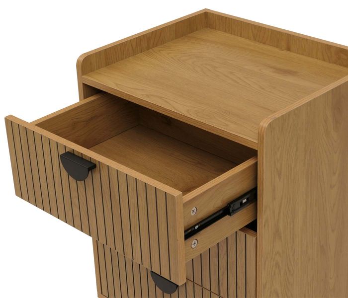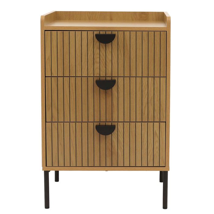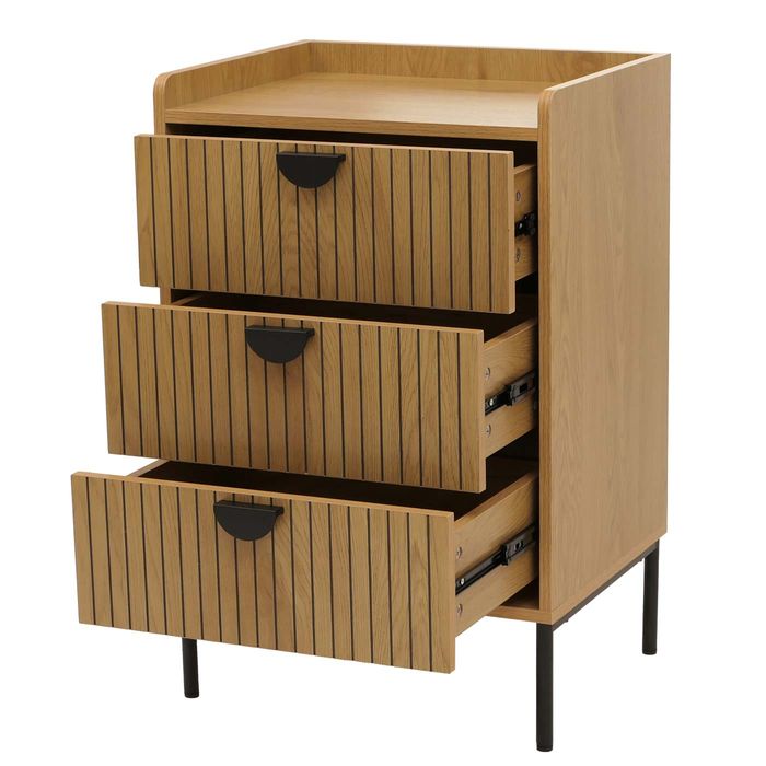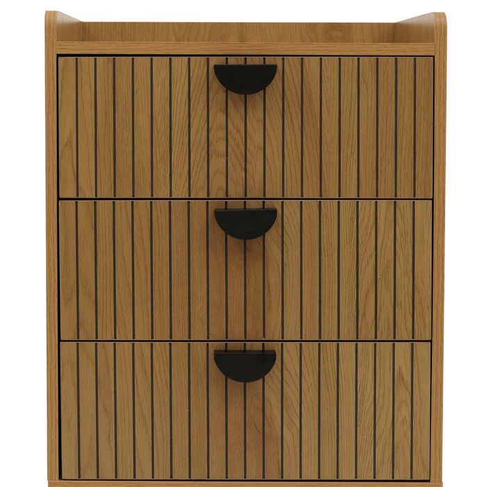 Die Kommode O39 überzeugt durch ihr modernes Lamellen-Design an den Schubladenfronten, das stilvolle Akzente setzt und jedem Raum eine zeitlose Eleganz verleiht. Mit drei grosszügigen Schubladen bietet sie viel Stauraum für Kleidung, Alltagsgegenstände oder Wohnaccessoires – ideal, um Ordnung mit Stil zu verbinden. Die kratzfeste und wasserabweisende Melamin-Beschichtung sorgt nicht nur für eine angenehme Haptik, sondern auch für eine langlebige und pflegeleichte Oberfläche, die dem täglichen Gebrauch mühelos standhält.