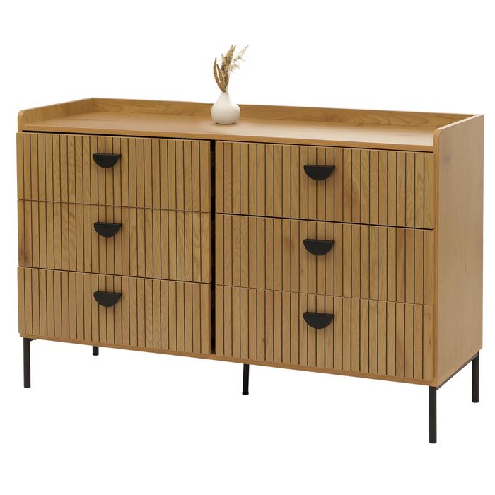 Die Kommode O39 vereint stilvolles Design mit durchdachter Funktionalität und ist die ideale Wahl für alle, die Wert auf hochwertige Verarbeitung und modernes Wohnambiente legen. Mit ihren sechs grosszügigen Schubladen bietet sie reichlich Stauraum für Kleidung, Accessoires oder Alltagsgegenstände und sorgt gleichzeitig für Ordnung und Übersicht in jedem Raum. Die eleganten Fronten im Lamellen-Design setzen stilvolle Akzente und machen das Möbelstück zu einem Blickfang, der sich harmonisch in unterschiedliche Einrichtungsstile einfügt. Die Oberfläche ist mit einer widerstandsfähigen Melamin-Beschichtung versehen, die nicht nur besonders kratzfest, sondern auch wasserabweisend ist – ideal für die tägliche Nutzung in Wohn-, Schlaf- oder Flurbereichen. Dank der hohen Belastbarkeit von bis zu 100 kg auf der Oberseite eignet sich das Highboard auch als dekorative Ablagefläche für Pflanzen, Bücher oder Bilderrahmen.