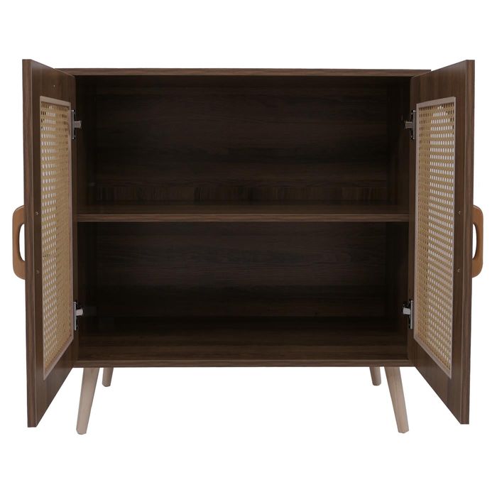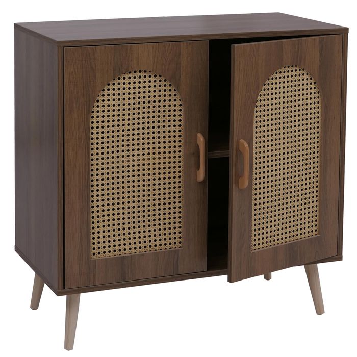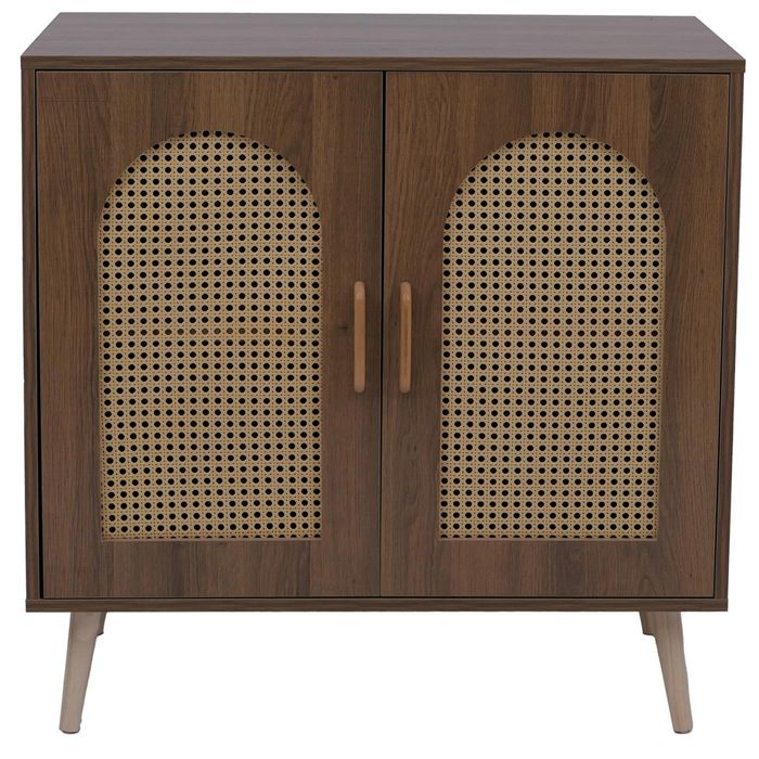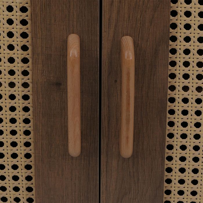 Die Kommode P51 verbindet modernes Design mit praktischer Funktionalität und schafft eine stilvolle Lösung für mehr Ordnung in Ihrem Zuhause. Die pflegeleichte Melamin-Oberfläche ist kratzfest und wasserabweisend, sodass die Anrichte auch bei täglicher Nutzung langlebig schön bleibt. Hinter den beiden Türen verbergen sich grosszügige Ablagefächer, die reichlich Platz für Geschirr, Bücher, Akten oder Wohnaccessoires bieten und für eine aufgeräumte Atmosphäre sorgen. Besonders ansprechend wirken die Türfronten mit dekorativem Poly-Rattan-Einsatz, die dem Schrank eine natürliche und zugleich moderne Note verleihen. Passend dazu ergänzen hochwertige Holzgriffe in warmer Naturfarbe den harmonischen Gesamteindruck und machen das Möbelstück zu einem Blickfang in jeder Einrichtung.